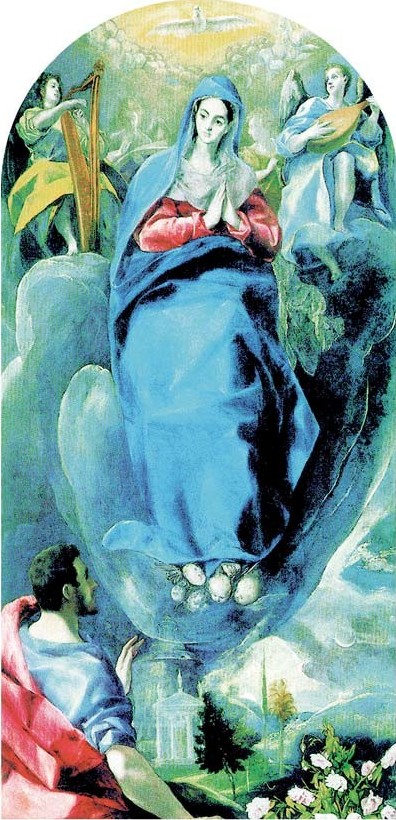 În stânga, jos, apostolul Ioan, care o contemplă pe Neprihănita, simbolizează pe fiecare credincios, care vede în fericita Fecioară modelul desăvârșit și, în același timp, învățătoarea și călăuza în viața Duhului.